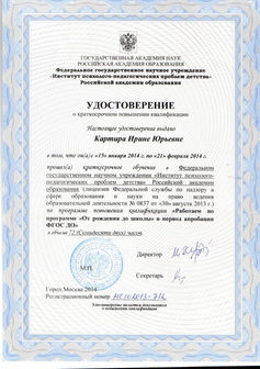 АНО ВПО «Московская педагогическая академия дощкольного образования», тема: «Работаем по программе «От рождения до школы» в период апробации ФГОС ДО», 72 ч. 2014 г.