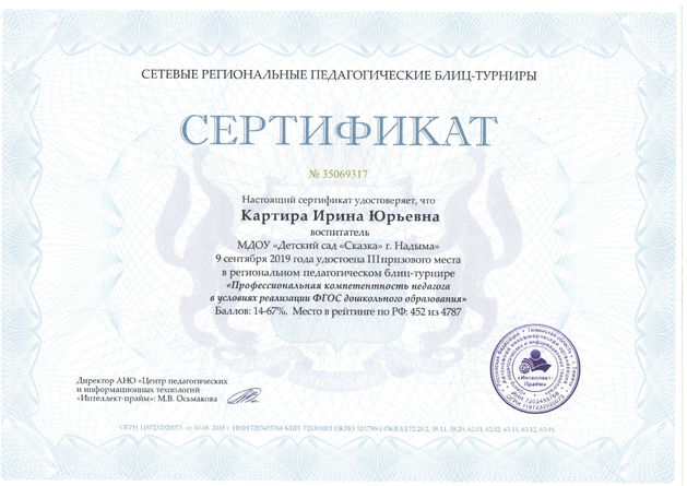 «Сетевые региональные педагогические блиц-турниры. Региональный педагогический блиц-турнир: «Профессиональная компетентность педагога в условиях реализации ФГОС дошкольного образования», III призовое место, 2019 г.