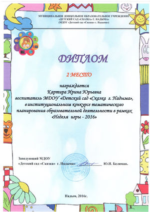 Первый региональный конкурс для детей и педагогов «Моя Югра», номинация: «Творческие работы и учебно- методические разработки педагогов», работа: «Конспект Образовательной деятельности на прогулке в старшей группе. Тема: «Осень», диплом II место, 2016г. ссылка