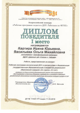 Образовательный проект «Воспитателям.ру». Всероссийский конкурс «Рабочая программа педагога ДОУ. Работаем по ФГОС», работа: «Рабочая программа воспитателей ДОУ в соответствии с ФГОС дошкольного образования (старшая группа, 4-5 лет)», диплом победителя I место, 2016 г.