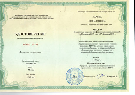 АНО ДПО «Московская академия профессиональных компетенций», программа «Педагогика инклюзивного образования в условии реализации ФГОМ (по уровням образования и предметным областям)» по предметным областям «Коррекционная психология и педагогика в дошкольной образовательной организации», 108 ч. 2017 г.
