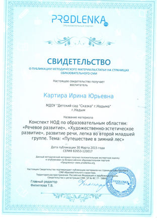 Образовательный портал «Продленка», методический материал: конспект НОД по ОО «Речевое развитие», «Художественно-эстетическое развитие», развитие речи, лепка «Путешествие в зимний лес», свидетельство о публикации, 2015 г. ссылка